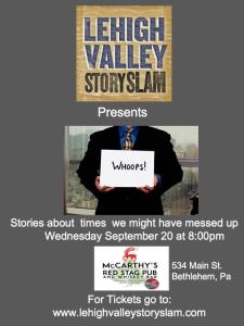 I thank you for letting me share my joy of true storytelling.  It is my hope that you can be part of the fun and attend a story slam, perhaps tell a story.  Our next one is September 20th and the Theme is “Whoops”. We welcome you with open arms and hope to see you soon.