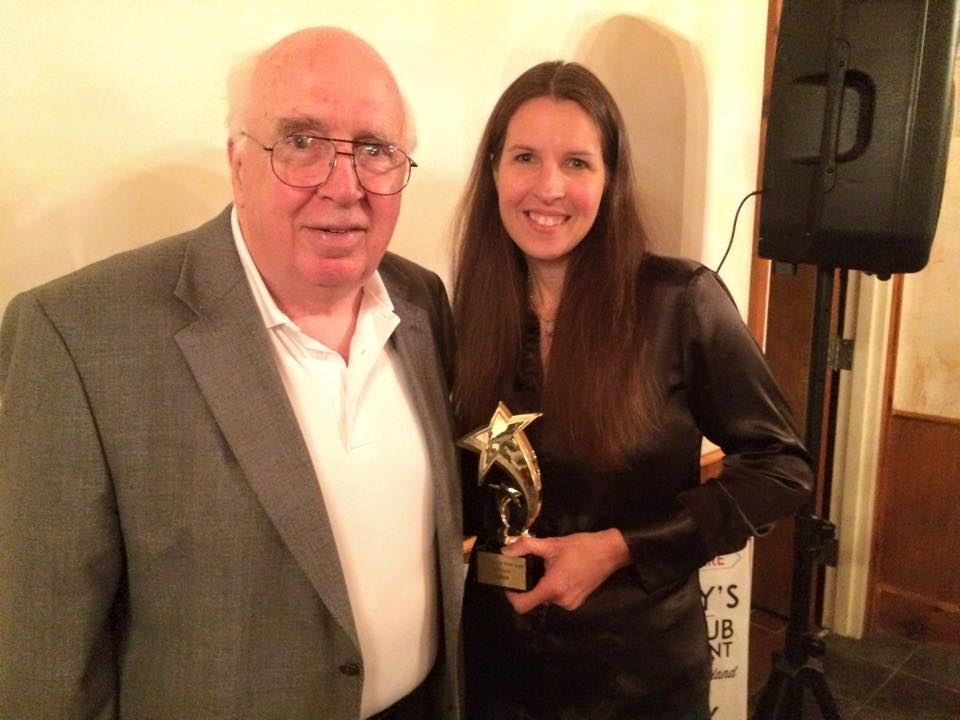 John Hughes won our “First Love” Story Slam with his tale of giving a girl in sixth grade a friendship ring and what has happened since. John won our “tacky trophy” and earned a slot in our Grand Slam, which will take place in November. He is pictured here with our emcee Rebecca Schorr.